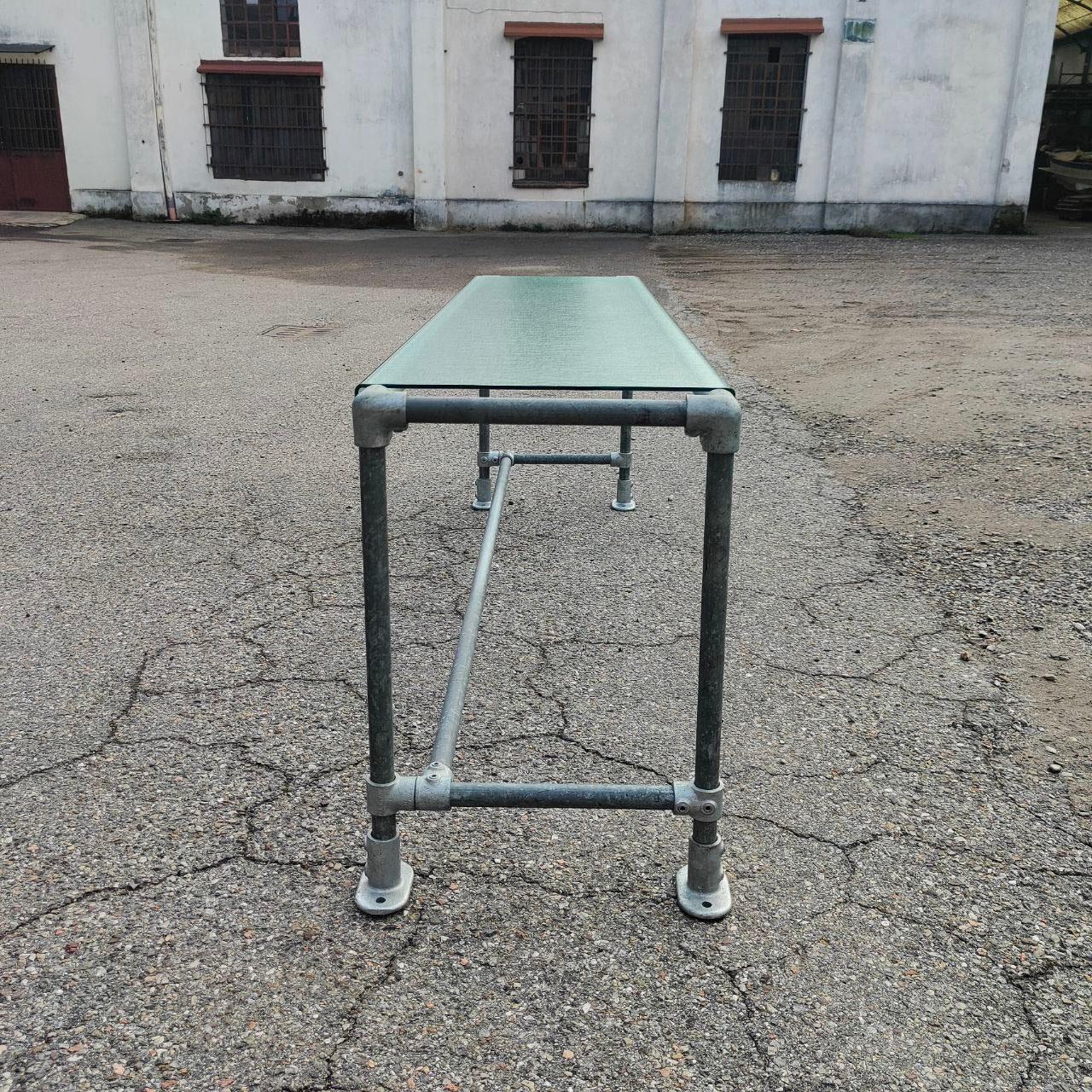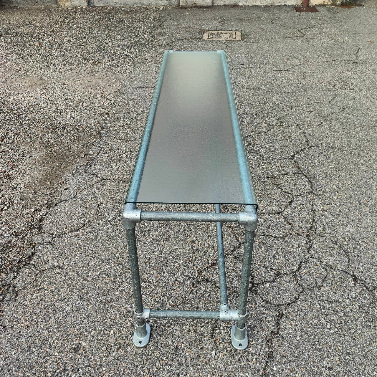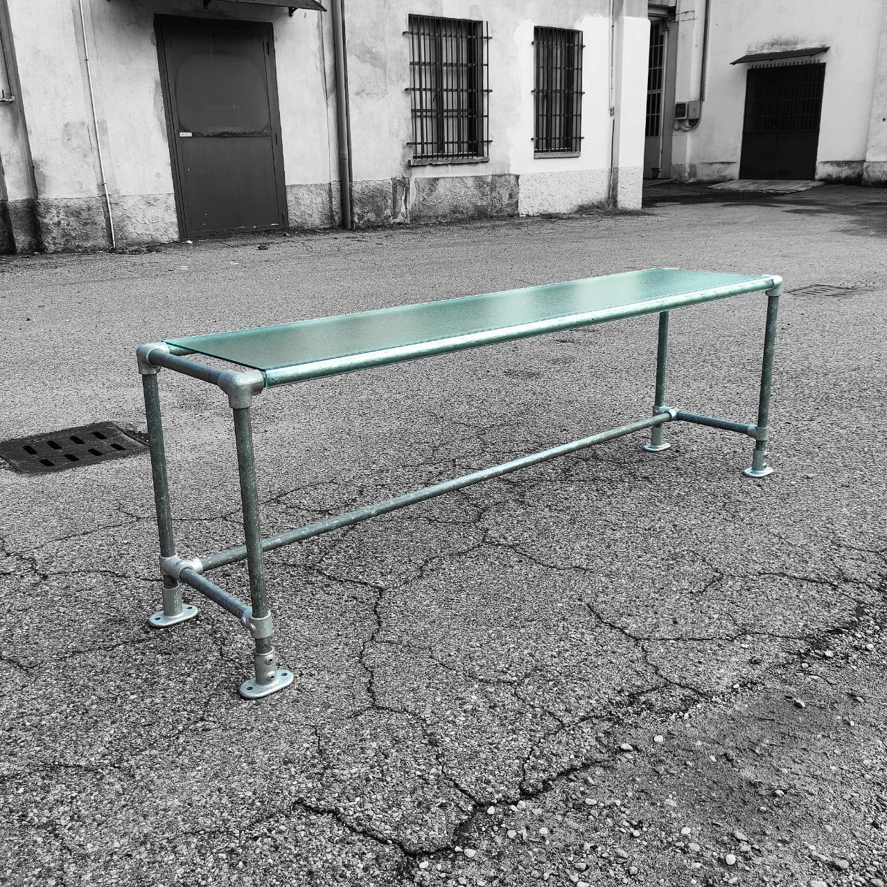 Piano in vetro satinato e sagomato con struttura in tubi di acciaio