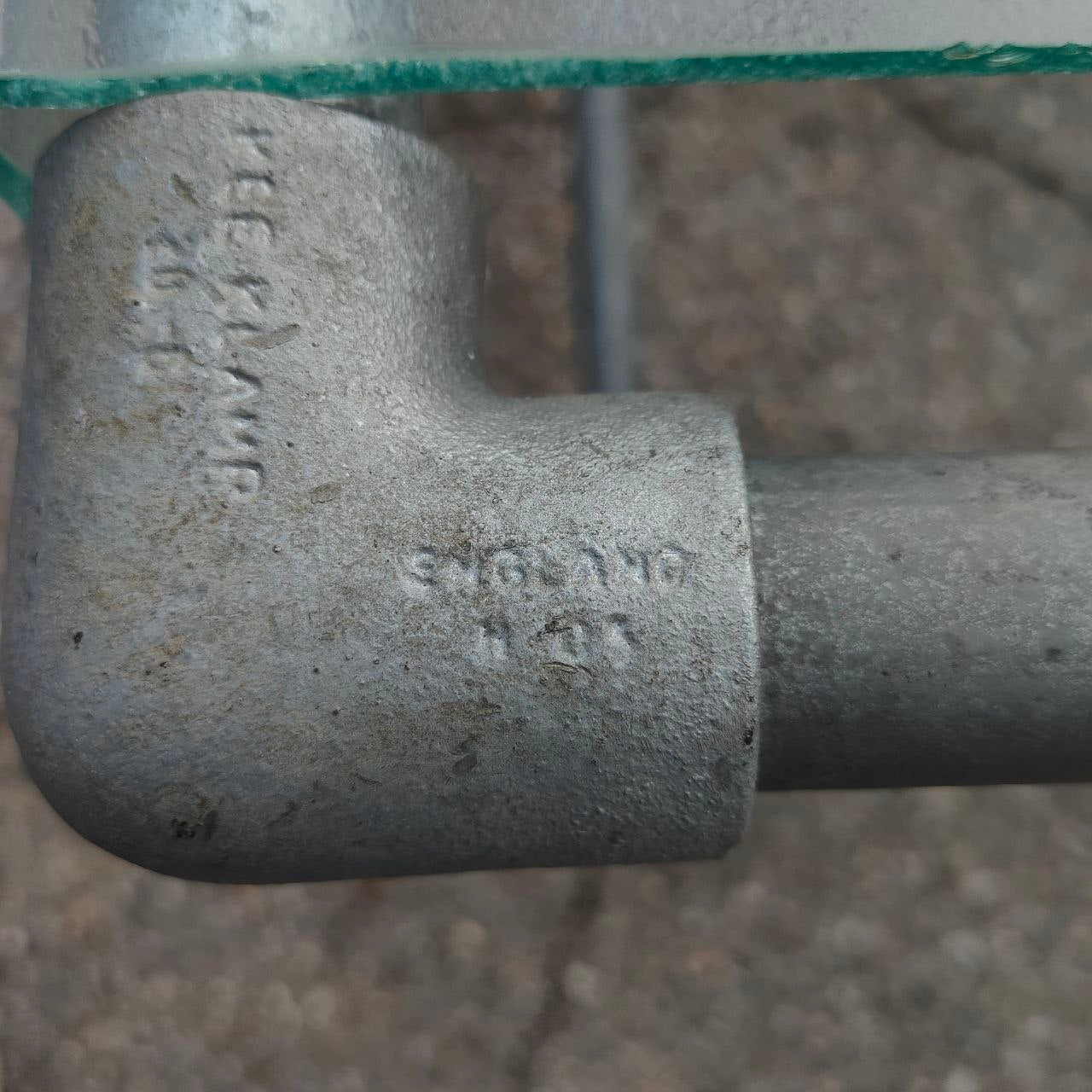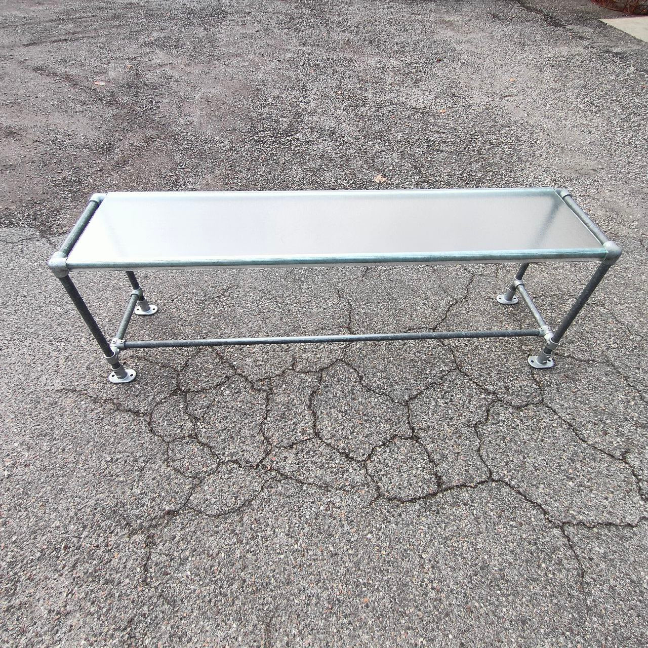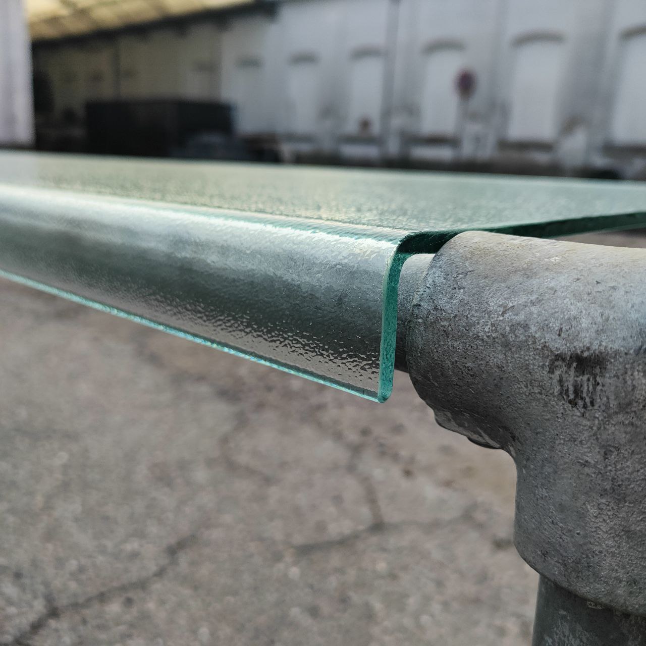 Piano in vetro satinato e sagomato con struttura in tubi di acciaio