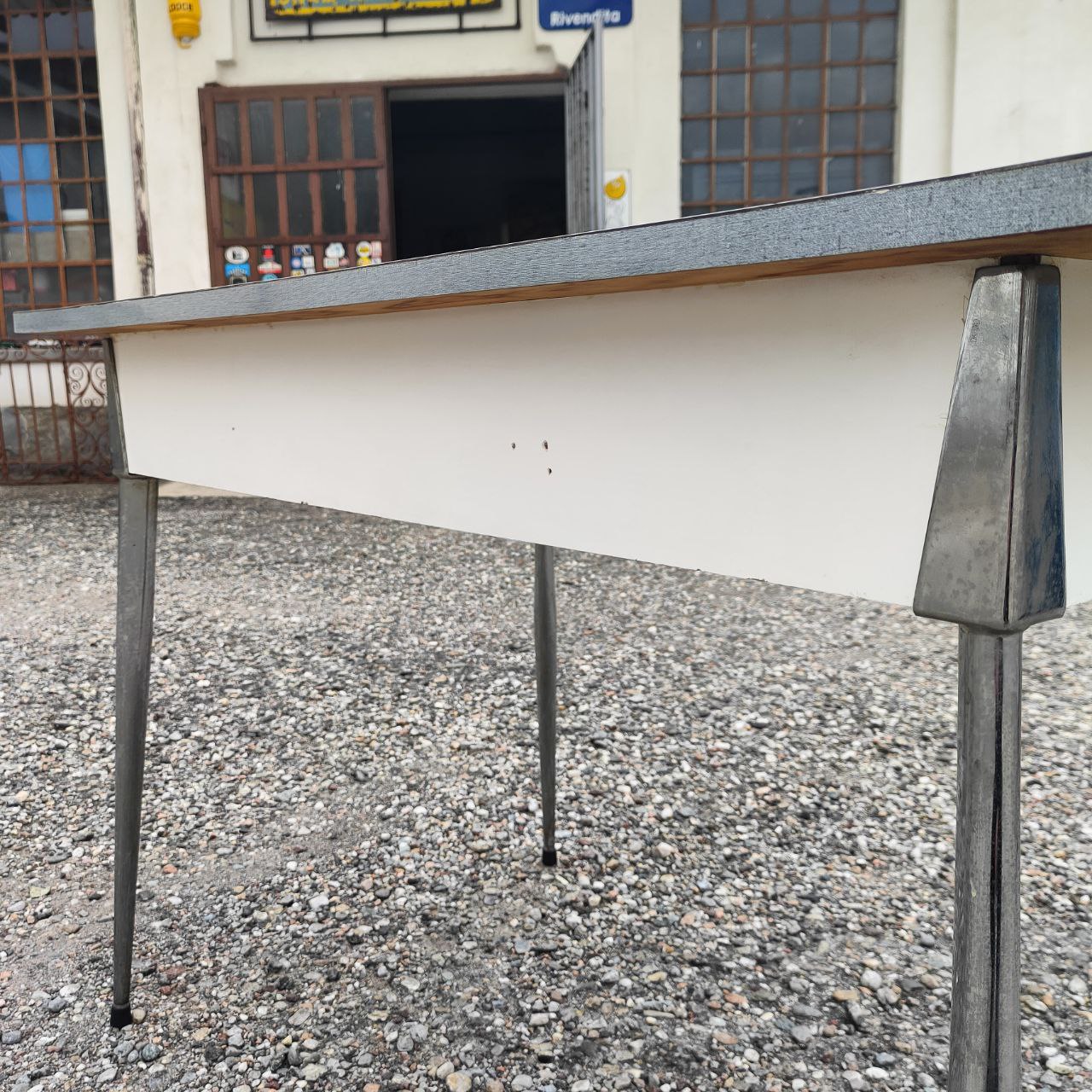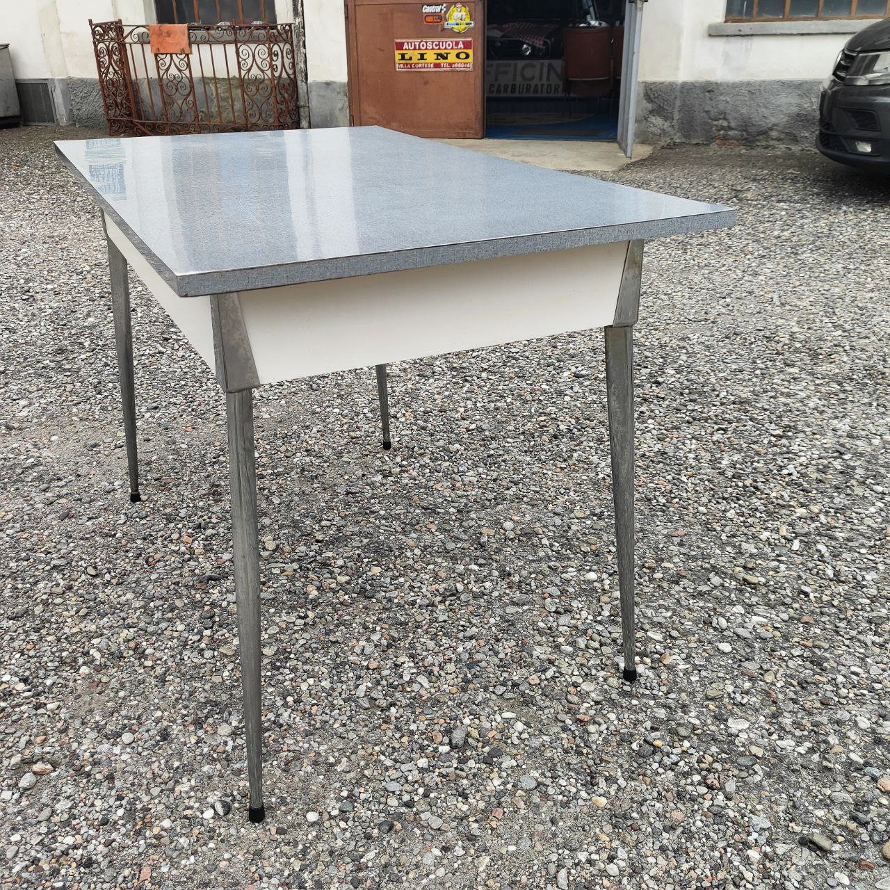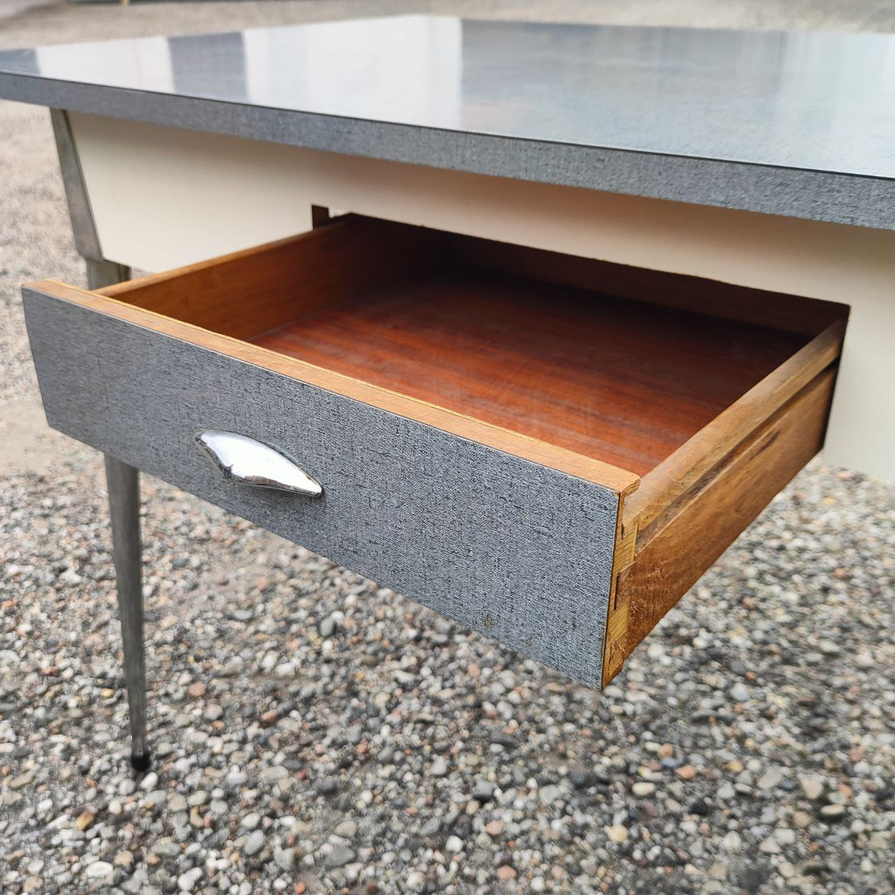 Mit Resopal überzogener Holztisch mit verchromtem Metallrahmen. Mit einer Schublade.