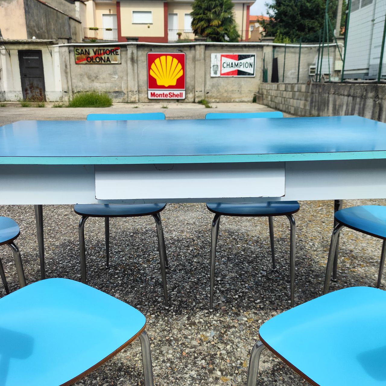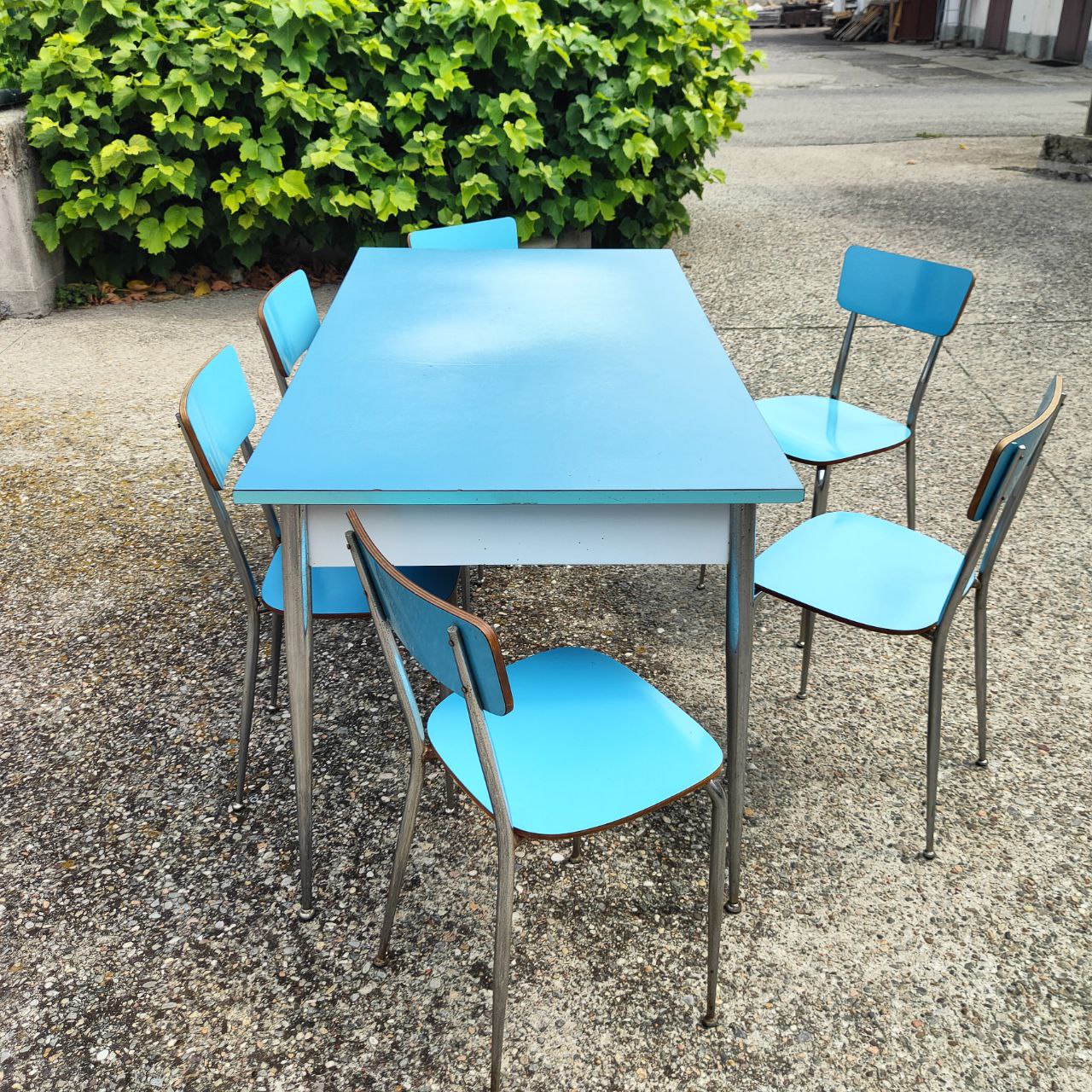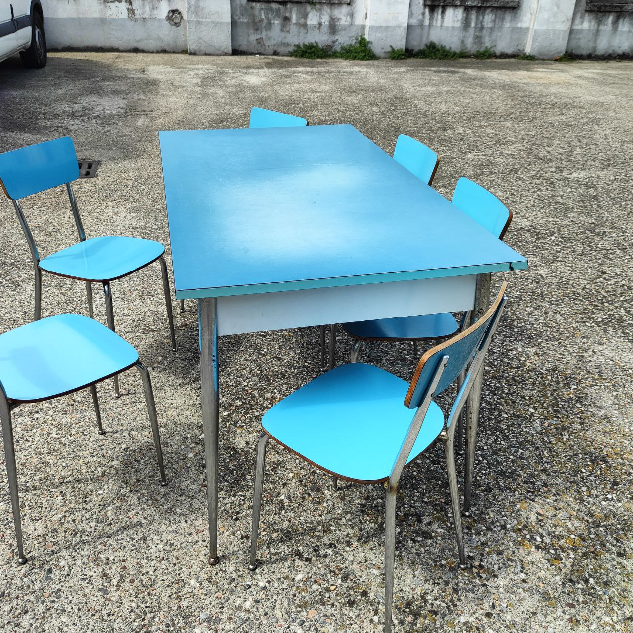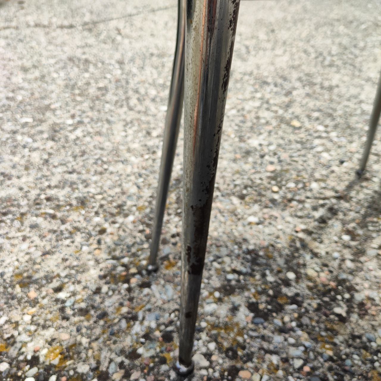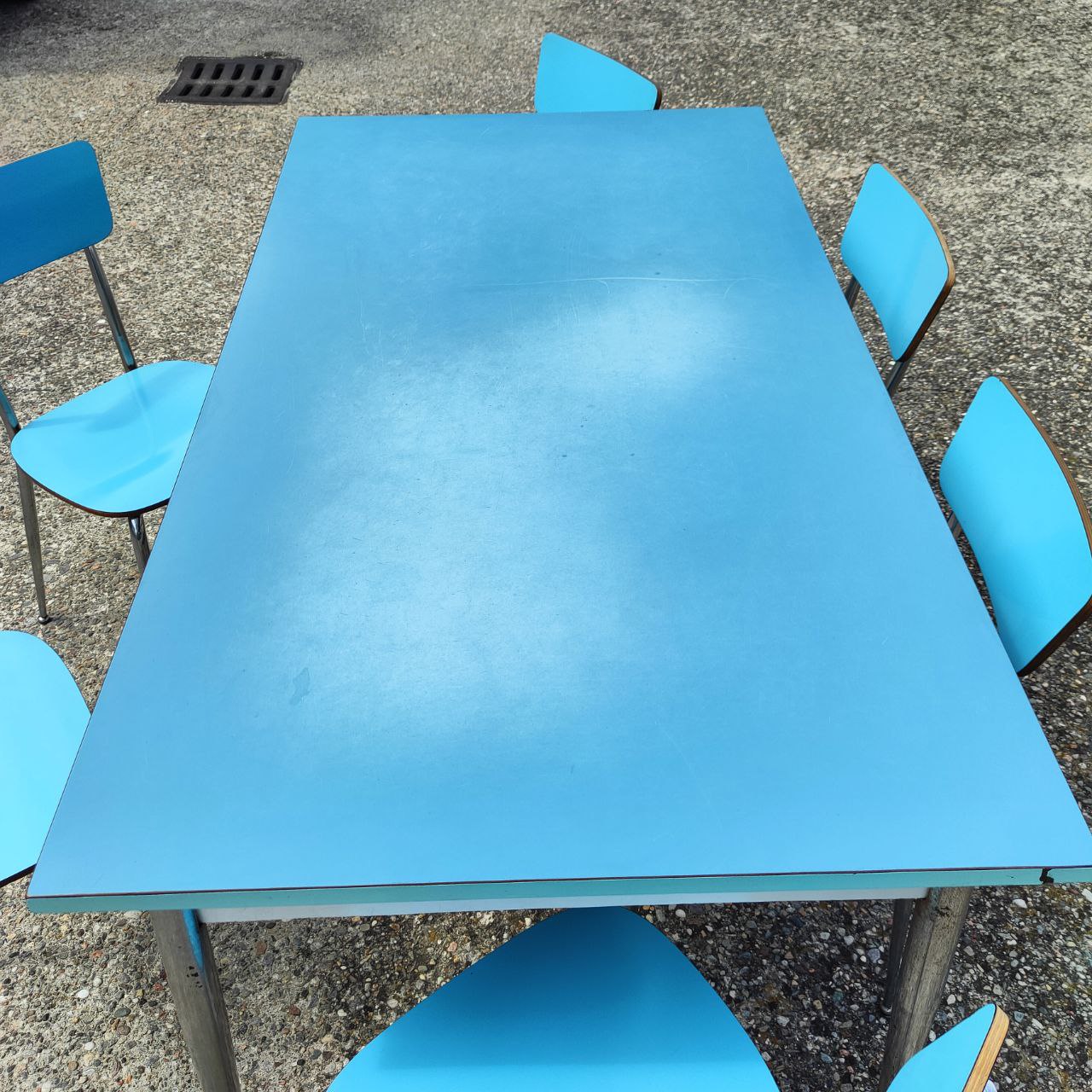Die Tisch- und Stuhlgestelle sind in einwandfreiem Zustand. Die Tischplatte weist deutliche Gebrauchsspuren auf, wie auf den Fotos zu sehen.