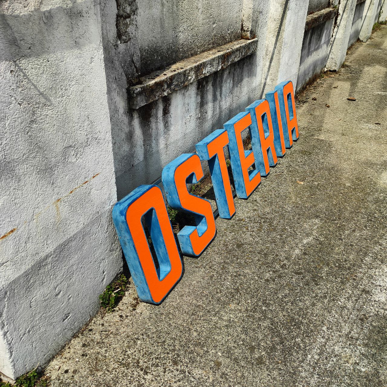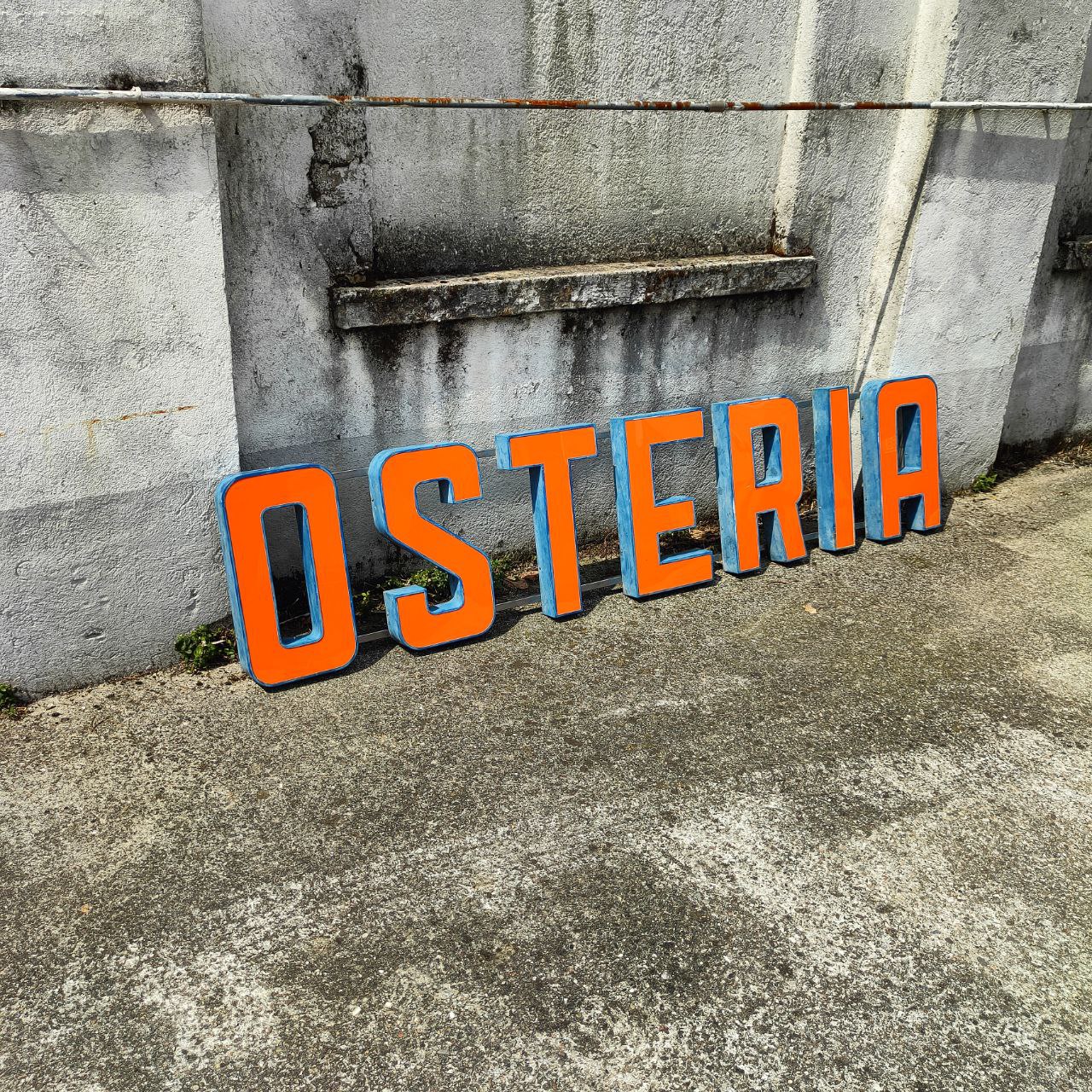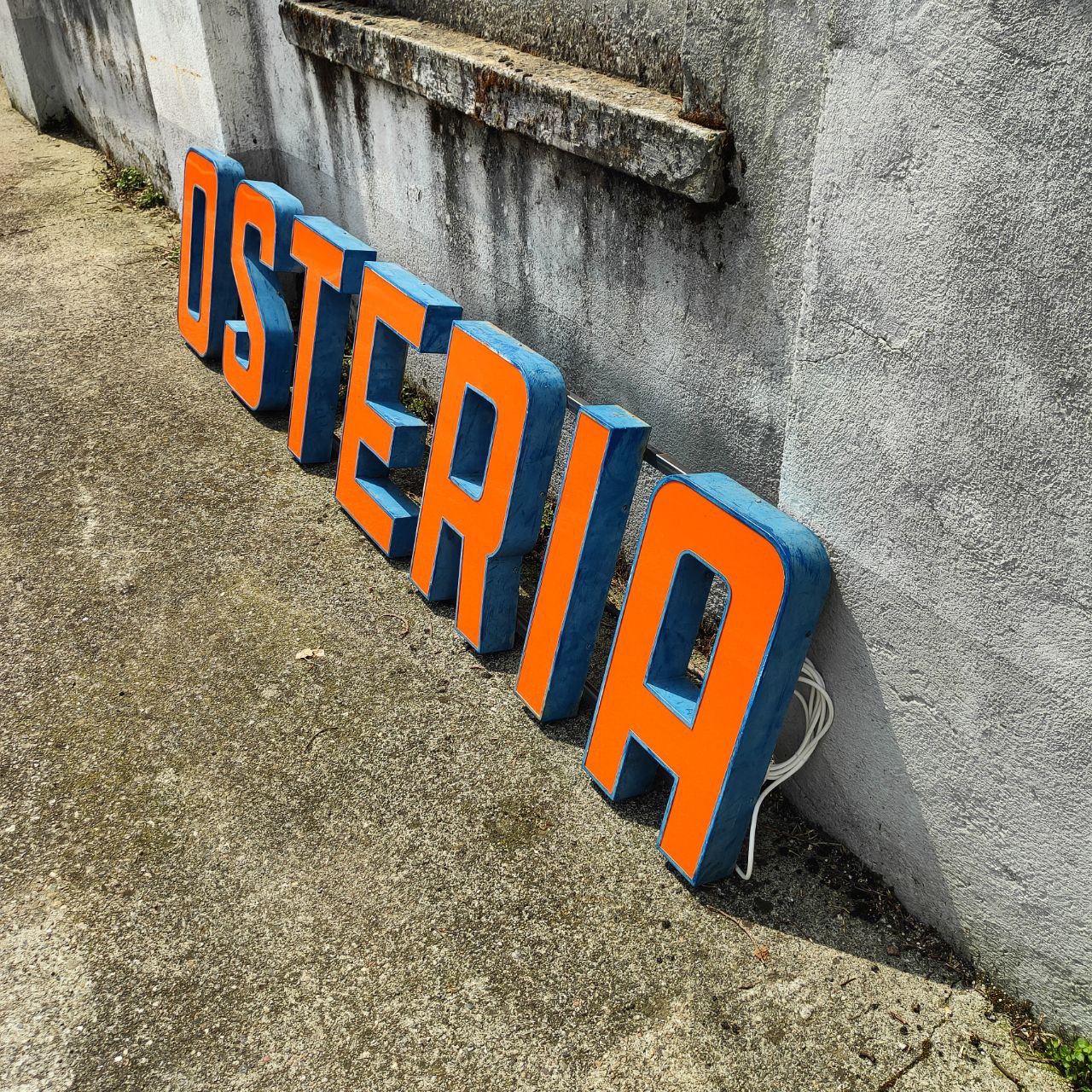 Insegna luminosa con lettere scatolate in metallo azzurre e plexiglass frontale arancione
